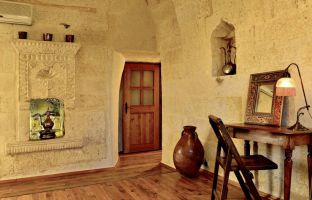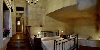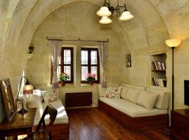Several couples or family & friends will enjoy the space, the cave-&-stone-house ambience, the modern conveniences, the cool & quiet. The golden volcanic tufa, with traditional stonework details, surrounds you. Windows let light into every room, some with fine views. Niches & closets carved into the cave walls provide storage for clothes, books and travel stuff. All of its rooms may be entered via a private corridor/ hallway, but they have separate outside entrances as well.